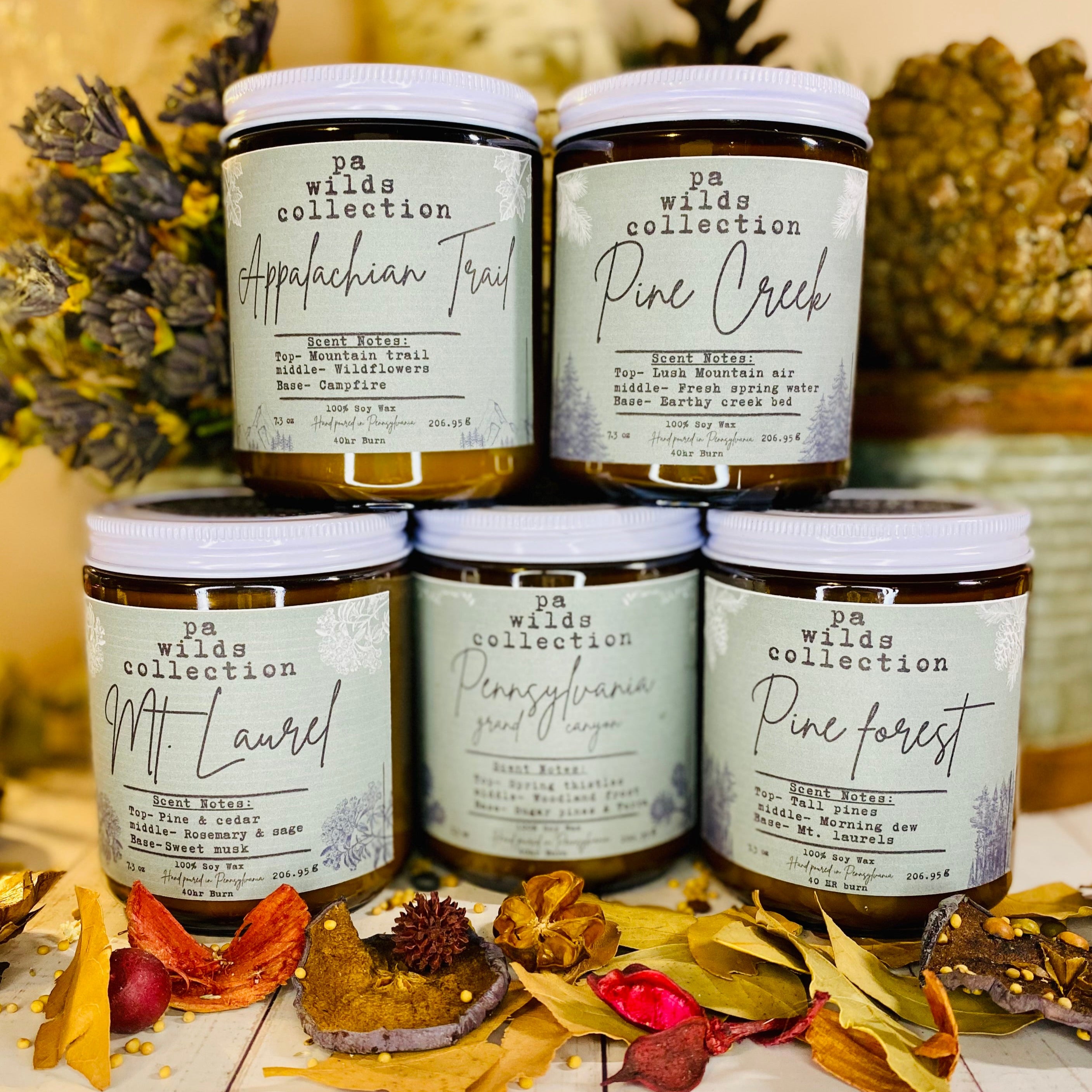 “Pa Wilds Collection is an ohmage to the beautiful landscapes of Pennsylvania. From the mountains of the Appalachian Trails home of the states flower the Mt. laurel, to rolling freshwater creeks and lush pine forests!”