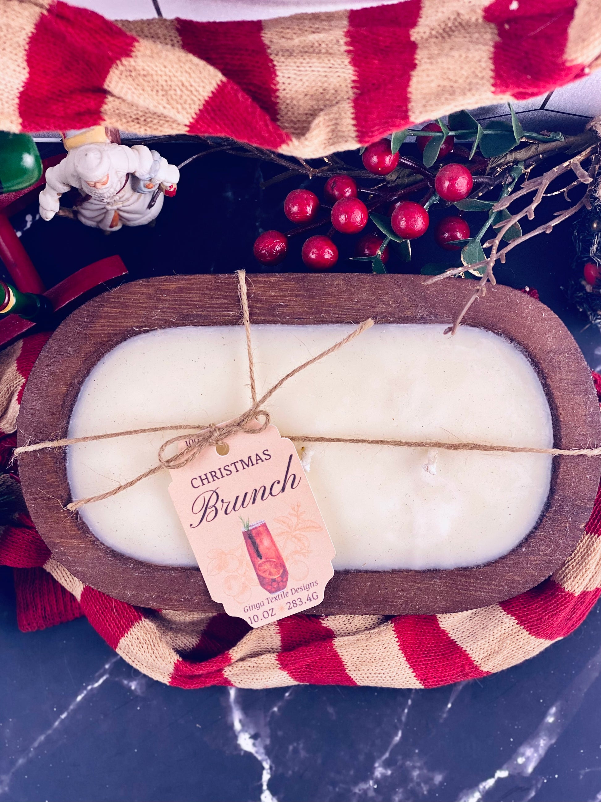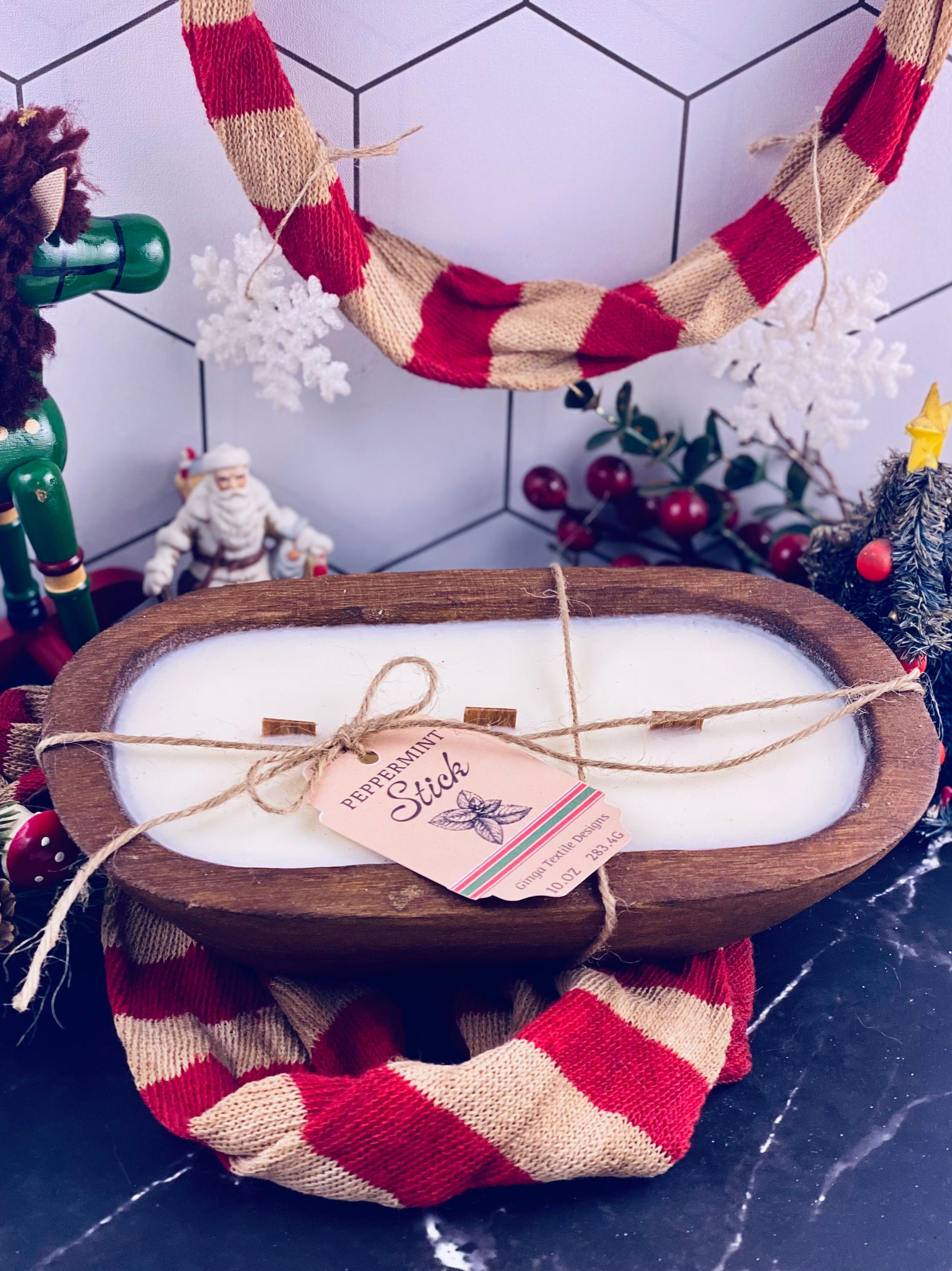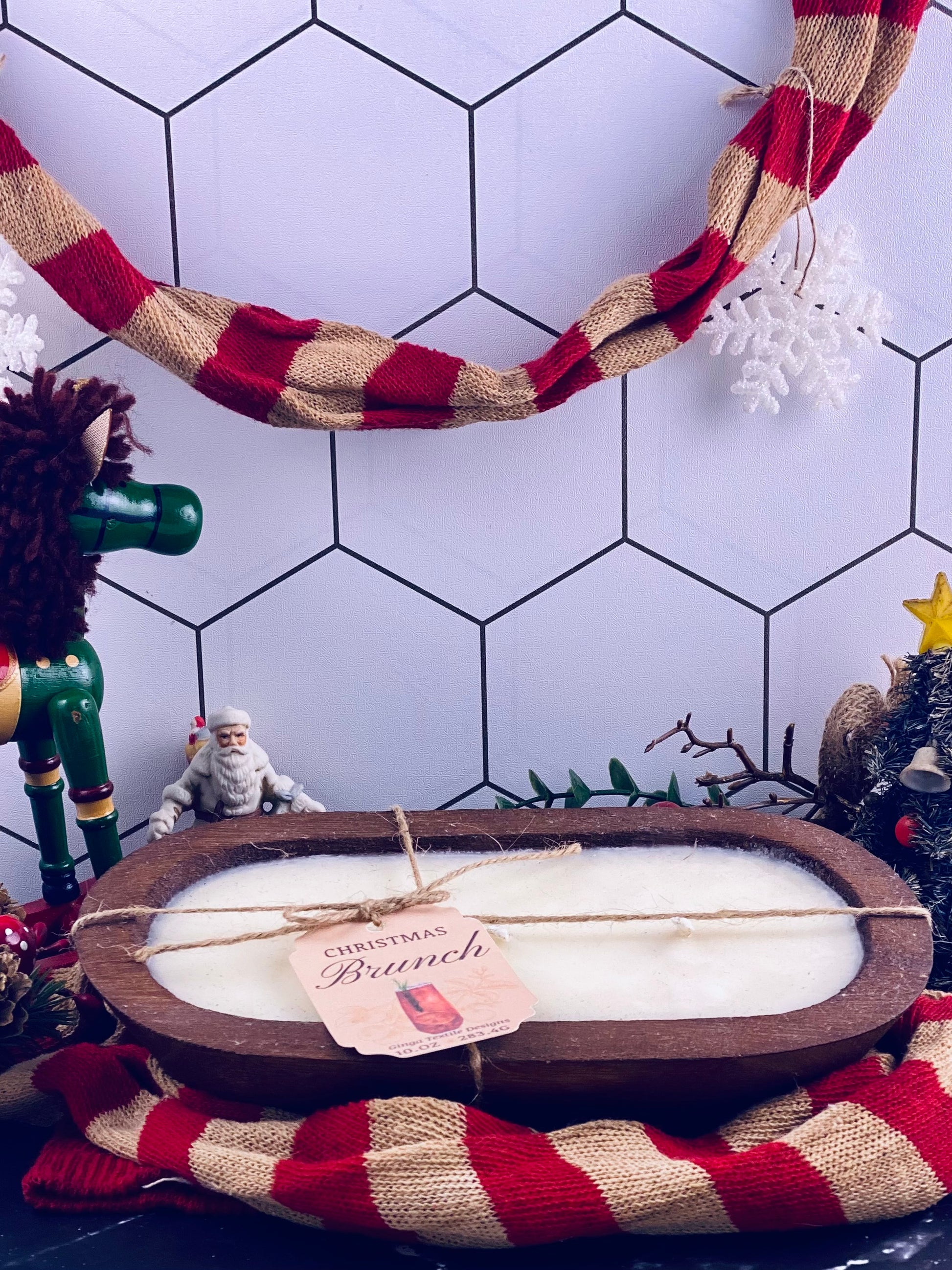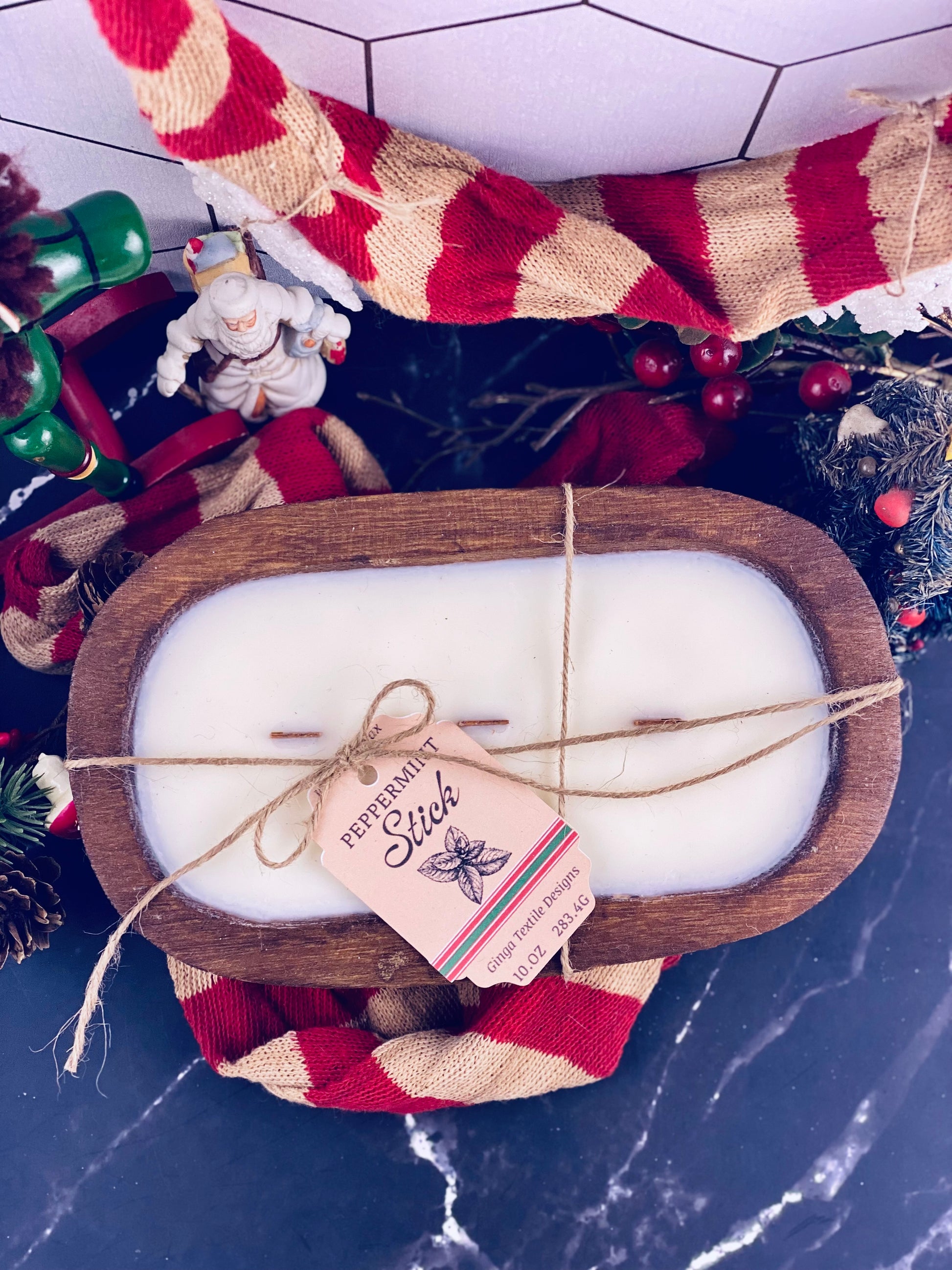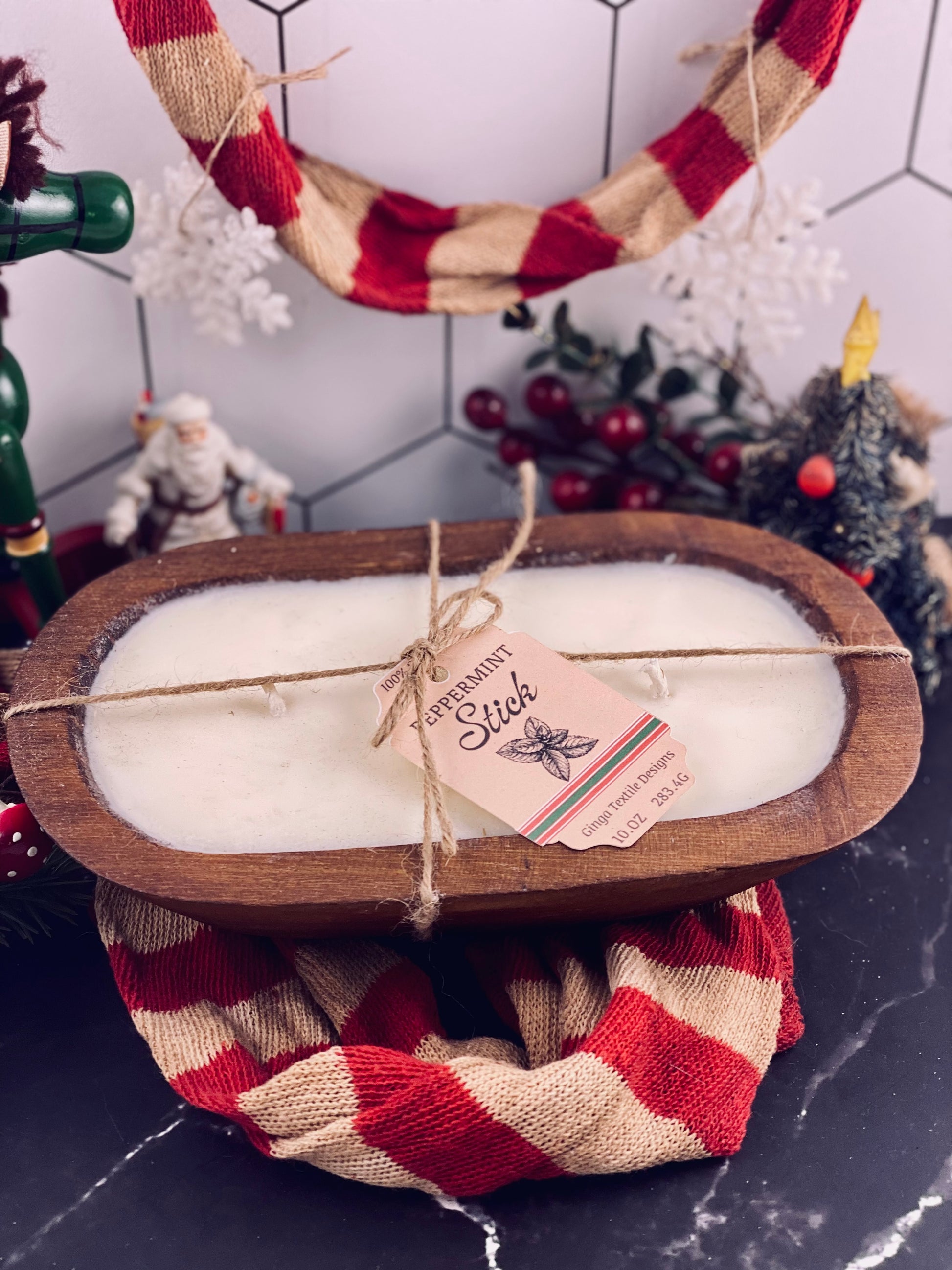 Limited edition Festive scents for this holiday season! Introducing Christmas Brunch and Peppermint Stick scented triple wicked candles inside wooden dough bowls. You have the choice of either scent as well as cotton wicks or wood wicks. Each candle is 10oz and made from 100% Soy wax as well as clean scents. Wood bowls are sealed in an earth safe sealer that is non-toxic and safe for burning.